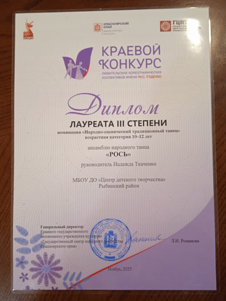 В Красноярске прошёл II этап краевого конкурса любительских хореографических коллективов имени выдающегося деятеля искусств Михаила Семёновича Годенко. В 2025 году на конкурсные просмотры II этапа приглашены 92 коллектива из 35 муниципальных образований Красноярского края. Центр детского творчества Рыбинского района на конкурсе представил ансамбль народного танца «РОСЬ», которому члены жюри присудили Диплом Лауреата III степени в номинации «Народно – сценический традиционный танец», в возрастной категории 10 – 12 лет.