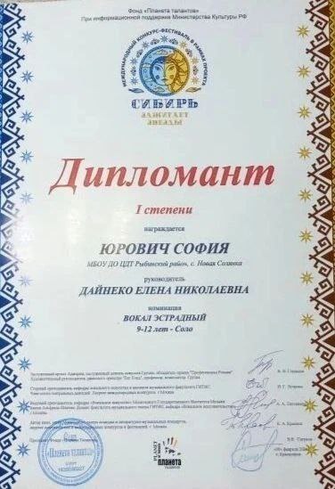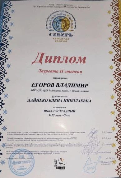 Обучающиеся объединения «Звонкие голоса» под руководством Елены Николаевны Дайнеко, педагога ДО ЦДТ, достойно выступили на Международном конкурсе-фестивале в рамках проекта «СИБИРЬ зажигает звезды» и стали лауреатами: Юрович София — 1 степени, Егоров Владимир — 2 степени.